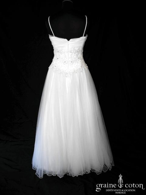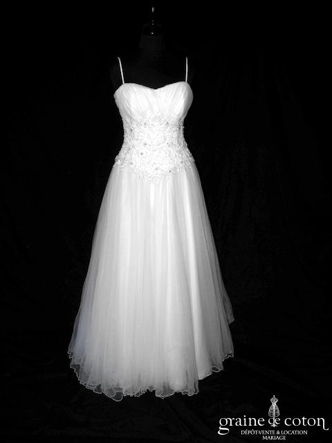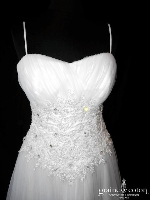 Robe une pièce en tulle blanc : bustier coeur avec fines bretelles, recouvert de dentelle perlée. Jupe épurée en tulle fluide, pas de traîne. Beau mouvement, seyante et légère.