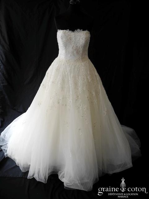 Robe une pièce ivoire clair : bustier droit recouvert de dentelle finement perlée, bien ajusté à la taille. Jupe évasée en tulle et rappel de la dentelle du bustier, traîne. Aérienne, lumineuse et seyante.