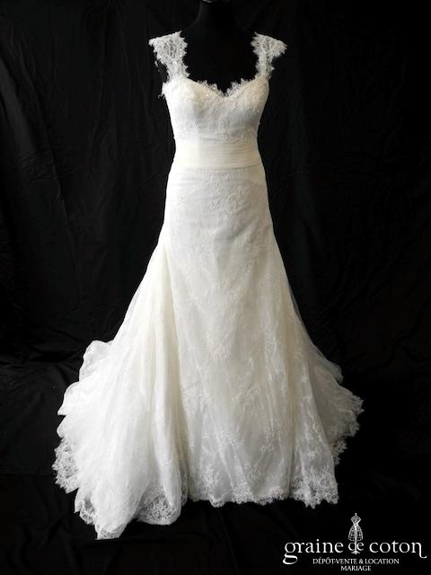 Robe une pièce en dentelle et tulle ivoire : bustier avec bretelles de dentelle amovibles, décolleté coeur et dos boutonné. Ceinture drapée de tulle à la taille. Jupe taille basse évasée tout en dentelle avec traîne de tulle souple. Raffinée délicate et classe.