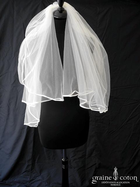 Voile court en tulle ivoire bordé d’un biais de satin. Avec rabat avant, monté sur peigne.