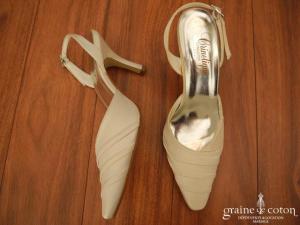 Escarpins en satin champagne à bout carré. Talon de 9,5 cm.