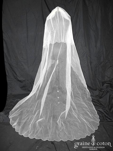 Voile long de 2,50 mètres en tulle ivoire clair bordé de fines perles