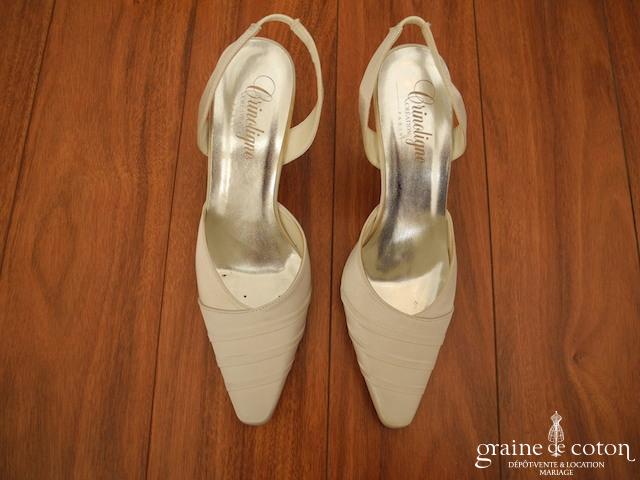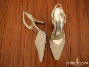 Escarpins en satin ivoire à bout carré. Talon de 9,5 cm.
