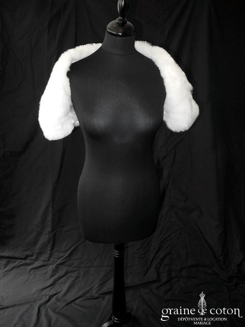 Boléro en fausse fourrure ivoire à enfiler, entoure juste les épaules et le haut du bras, ne couvre pas la robe devant. Original et bien coupé.