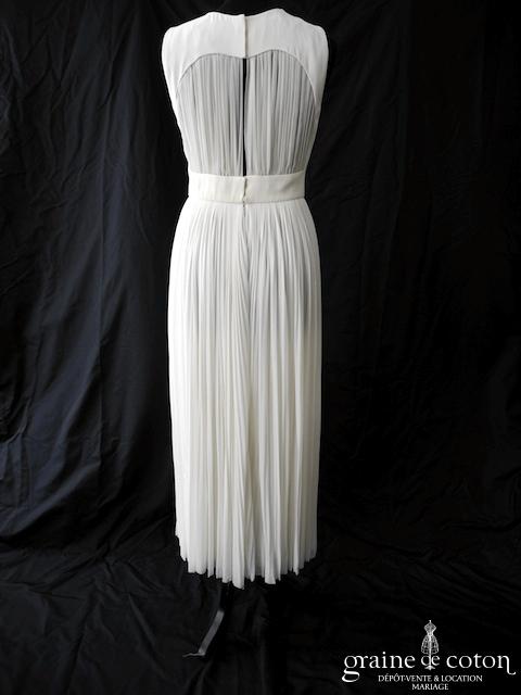 Robe une pièce en mousseline et crêpe de soie ivoire : décolleté rond avec larges bretelles, dos fendu. Jupe plis soleil mi longue (à la cheville ou au mollet) en mousseline de soie, magnifique tombé. Ceinture idéalement assortie disponible sous la référence 3878.