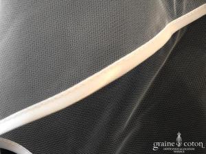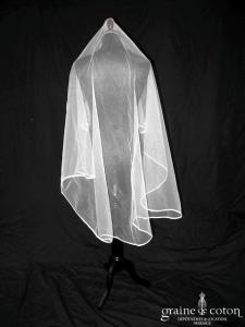 Voile mi long en tulle blanc bordé d’un biais de satin. Non monté sur peigne, avec rabat avant.