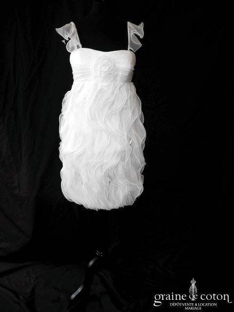 Robe courte en organza ivoire : bustier avec fines bretelles, coupe empire. Jupe droite avec volants d’organza. Lumineuse, légère, idéale pour une cérémonie civile.