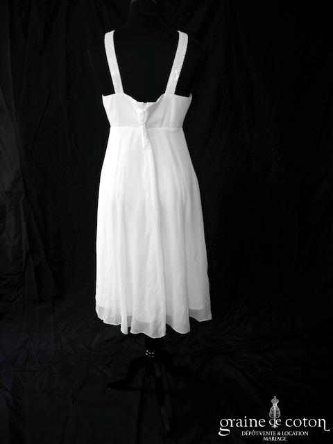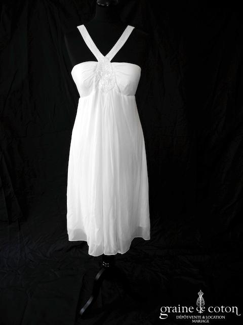 Robe une pièce courte : bustier empire avec larges bretelles perlées délicatement. jupe au genou fluide en mousseline de soie ivoire. Légère et seyante, idéale pour une cérémonie civile.