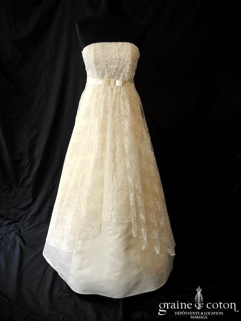 Robe une pièce ivoire : bustier en dentelle droit coupe empire/haute marquée par une ceinture de satin. Dos lacé. Jupe trapèze évasée sans traîne, en satin recouverte d’un pan de dentelle plus court, ouvert sur l’avant. Seyante et raffinée.