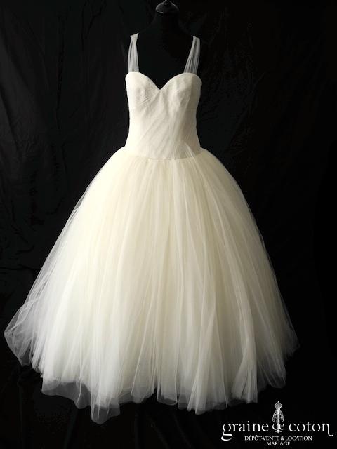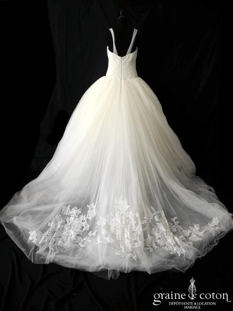 Robe une pièce ivoire : bustier drapé de tulle et dentelle avec bretelles en tulle souple. Jupe taille basse largement évasée tout en tulle avec longue traîne, rappel de la dentelle du bustier sur le bout de traîne. Une robe spectaculaire, voluptueuse et élégante.