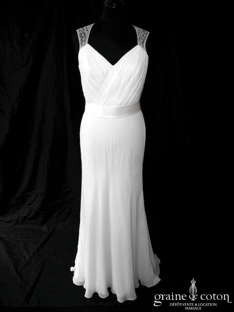 Robe une pièce en mousseline ivoire clair : bustier drapé avec encolure en tulle rebrodé, larges bretelles, dos boutonné. Taille haute ceinturée tombé fluide sirène avec mini traine. Lumineuse et élégante.