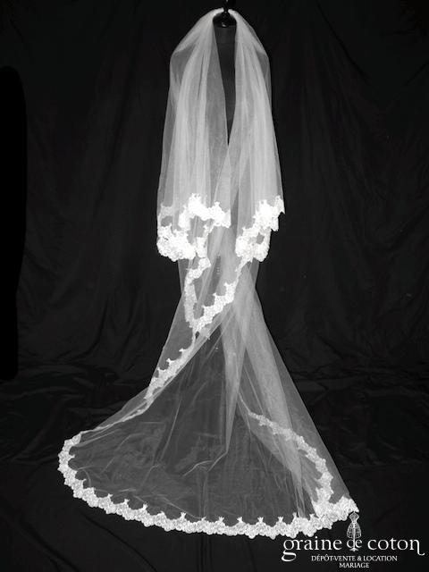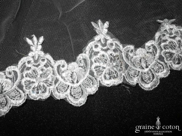 Voile long de 3 mètres en tulle ivoire clair bordé de dentelle perlée. Monté sur peigne, avec rabat avant.