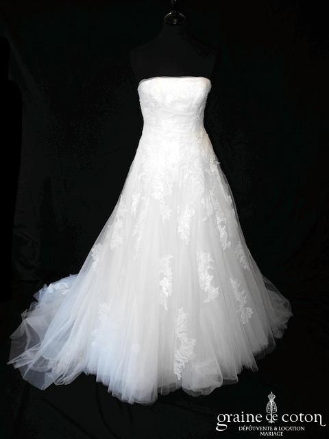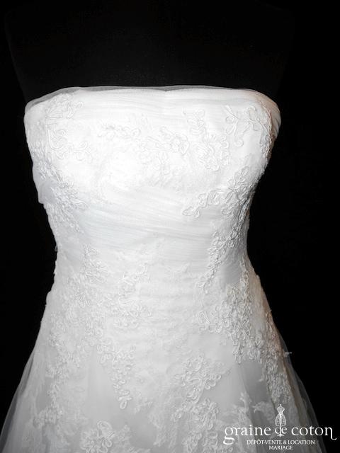 Robe une pièce ivoire clair : bustier drapé de tulle avec guipure de dentelle. Jupe évasée en tulle fluide et rappel des guipures du bustier, traîne pouvant se relever par un crochet. Légère, lumineuse et princesse !