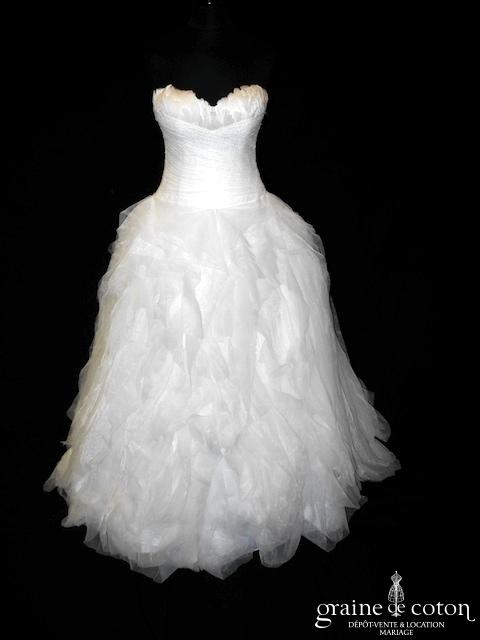 Robe une pièce ivoire clair : bustier empire forme coeur, recouvert de plumes puis drapé de dentelle. Taille haute, dos boutonné. Jupe largement évasée en mouchoirs d’organza et de dentelle, petite traîne. Somptueuse et spectaculaire.