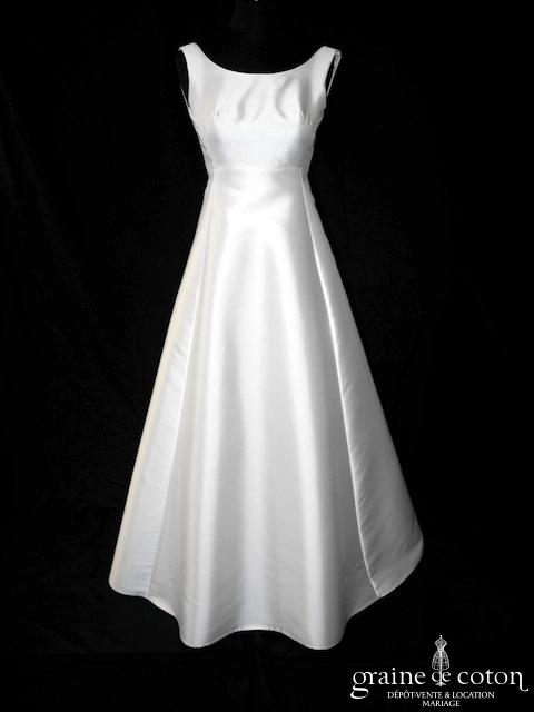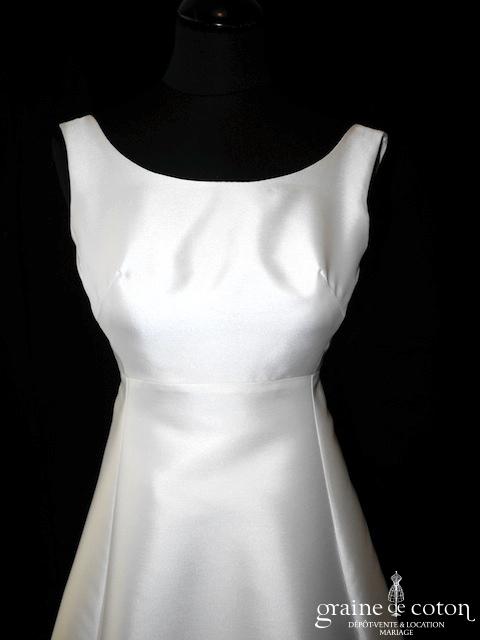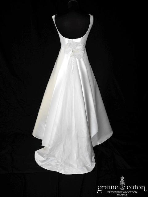 Robe une pièce en mikado de soie ivoire : bustier empire avec larges bretelles, dos largement décolleté et boutonné. Jupe trapèze épurée bien évasée avec petite traîne en organza de soie. Deux fleurs en organza de soie commencent la traîne dos à la taille. Intemporelle, pure et chic.