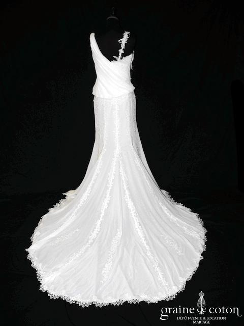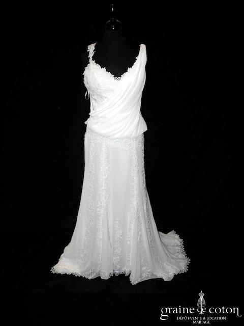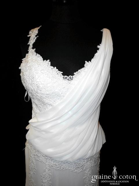 Robe une pièce en mousseline et dentelle ivoire clair : bustier avec larges bretelles, décolleté V, drapé. Jupe taille basse fluide avec rappel de guipure de dentelle et longue traîne relevable par des rubans. Moderne, délicate et lumineuse.