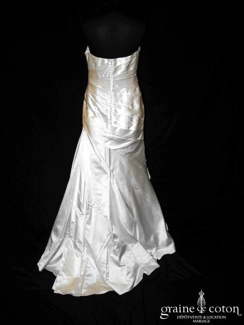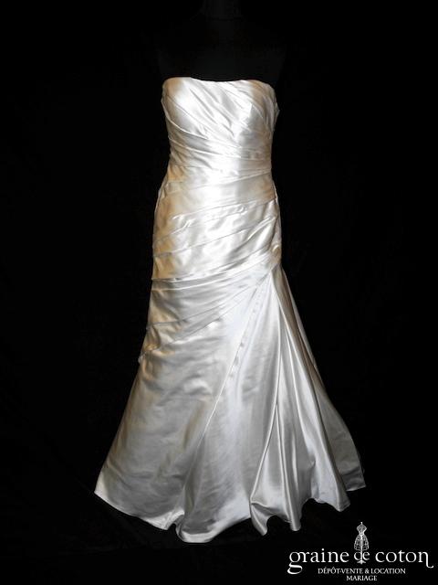 Robe une pièce en satin ivoire : bustier drapé marquant bien la taille et le haut des hanches. Jupe taille basse façon sirène légèrement évasée avec plusieurs pans de satin, pas de traîne. Classe et seyante.