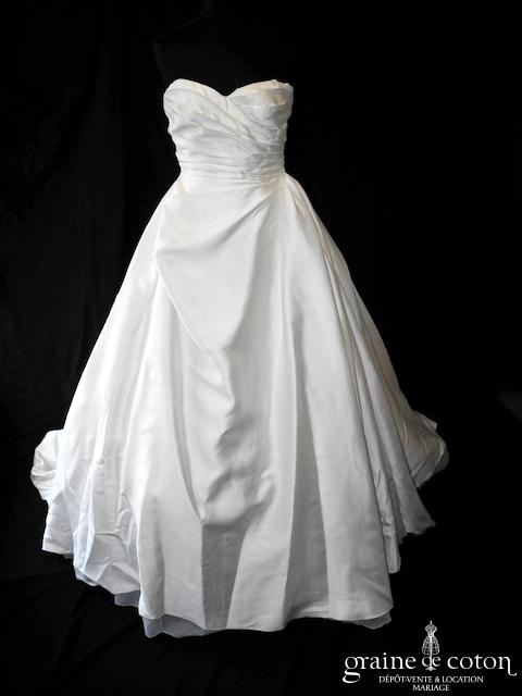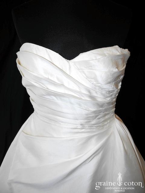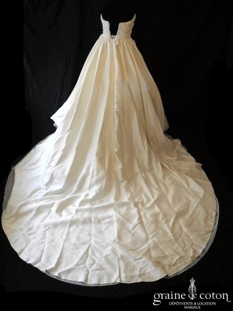 Robe une pièce en mikado de soie ivoire : bustier coeur drapé taille haute. Jupe largement évasée épurée avec longue traîne. Un modèle somptueux et pur.