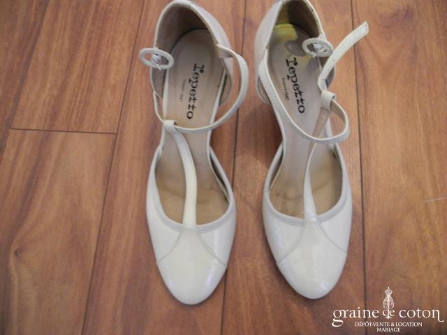 Salomés vernis ivoire avec bride avant et talon stable de 7,5 cm.