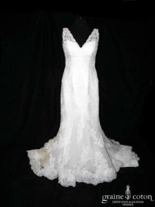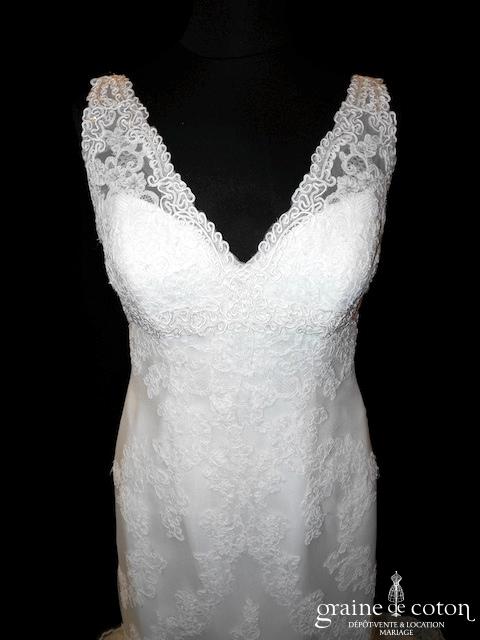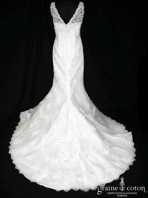 Robe une pièce tout en dentelle ivoire : bustier avec larges bretelles, dos boutonné. Jupe sirène prêt du corps légèrement évasée, avec longue traîne pouvant se relever. Glamour, classe et délicate.