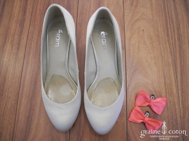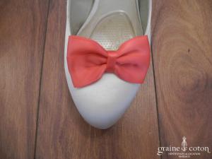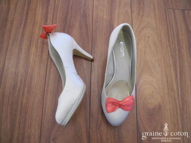 Escarpins à bouts ronds en satin ivoire avec clips noeuds amovibles fuchsia. Talon de 8 cm.