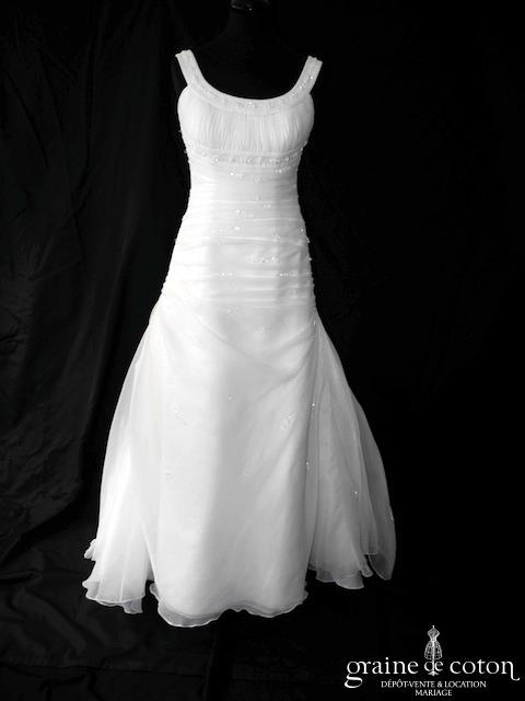 Robe une pièce en gaze ivoire clair : bustier drapé empire, décolleté arrondi se prolongeant en bretelles. Jupe taille basse asymétrique volumineuse sans traîne. Moderne, seyante et lumineuse !