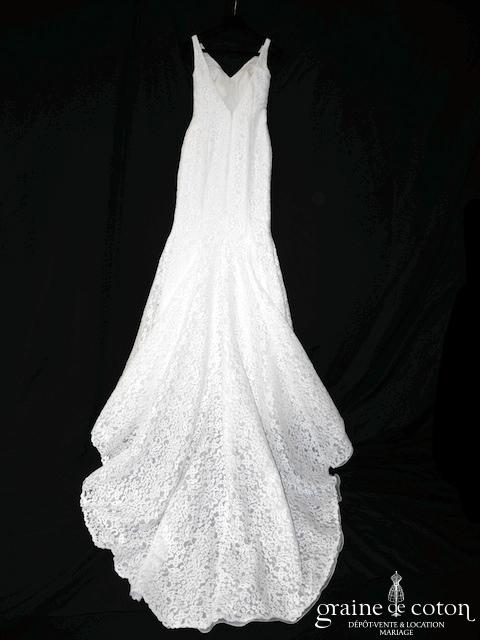 Robe une pièce tout en dentelle ivoir eclair : bustier décolleté V avec bretelles, dos nu profond. Jupe sirène très ajustée avec longue traîne? Possibilité d’ajouter un crochet pour la remonter. Glamour et classe, très belles matières.