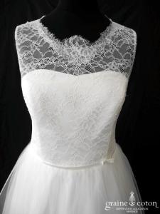 Robe une pièce ivoire clair : bustier coeur en mousseline recouvert d’un caraco en dentelle avec larges bretelles façon manches. Dos boutonné, ceinturé à la taille. Jupe en tulle fluide ivoire, épurée, sans traîne. Classe, élégante et raffinée.