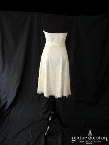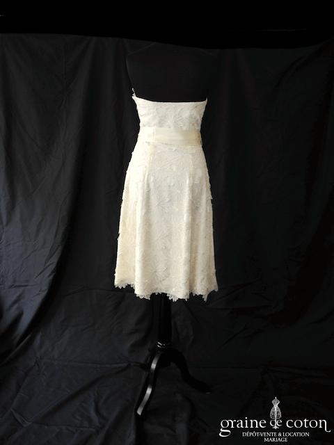 Robe une pièce sous le genou en dentelle et organza ivoire : bustier légèrement coeur avec fleurs en relief d’organza, ceinture à la taille. Jupe courte dans les mêmes motifs. Idéale pour une cérémonie civile.