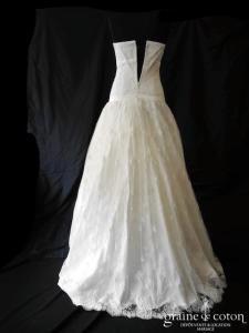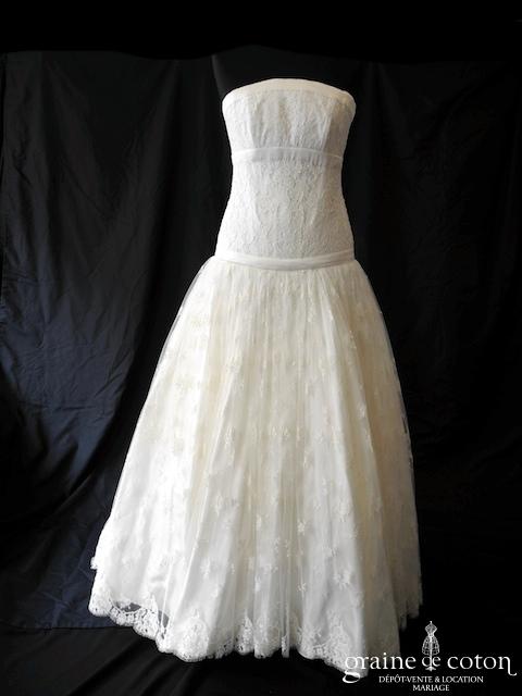 Robe une pièce tout en dentelle ivoire : bustier droit taille marquée empire par un ruban de satin de soie. Jupe taille basse tout en dentelle également, forme évasée avec petite traîne. Bohème et princesse.