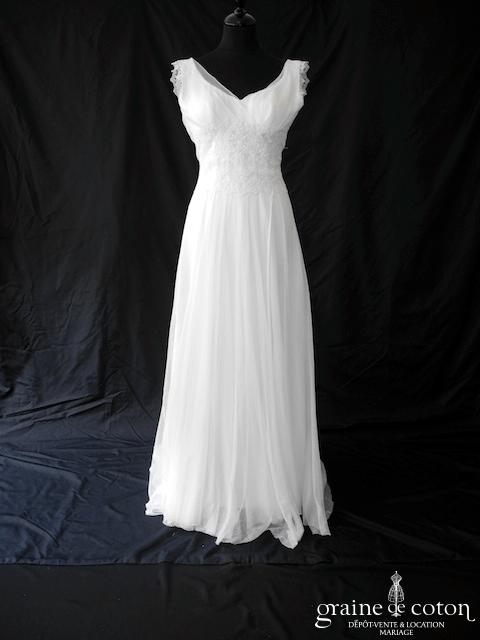 Robe une pièce ivoire clair : bustier en dentelle et mousseline de soie drapé, larges bretelles. Dos boutonné. Jupe fluide en mousseline. Pure et bohème chic.