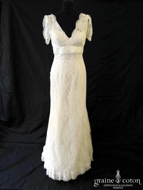 Robe une pièce composée de 2 robes : une sous robe en satin et une sur robe en dentelle fluide ivoire. Top coupe empire, décolleté V, petites manches. Jupe fourreau avec petite traîne pouvant se relever. Bohème chic, tout en délicatesse.