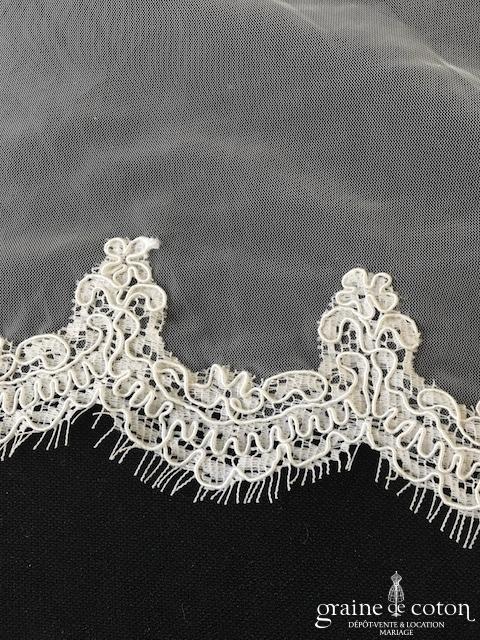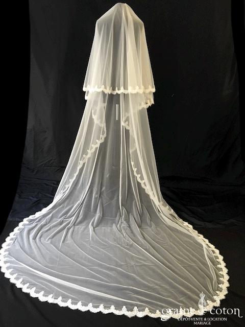 Voile long de 3 mètres en tulle fluide ivoire clair bordé de dentelle. Avec rabat avant, monté sur peigne.