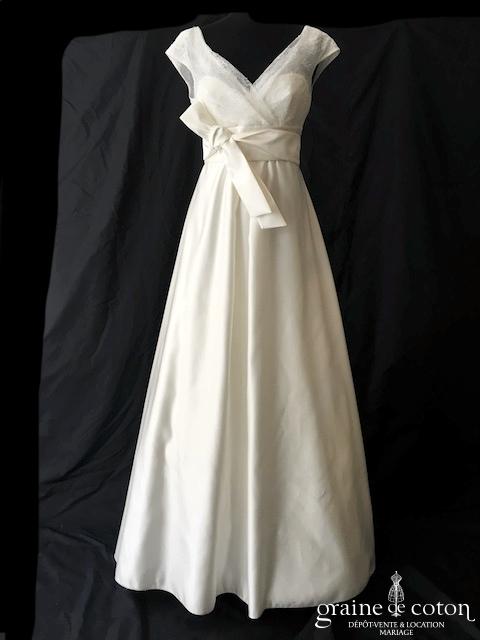 Robe une pièce ivoire clair : bustier en dentelle décolleté V, coupe empire, avec larges bretelles façon petites manches sur les épaules. Dos en V, boutonné. Jupe taille haute avec large ceinture à nouer devant ou derrière en satin, petite traîne. Belles finitions, délicate et raffinée.