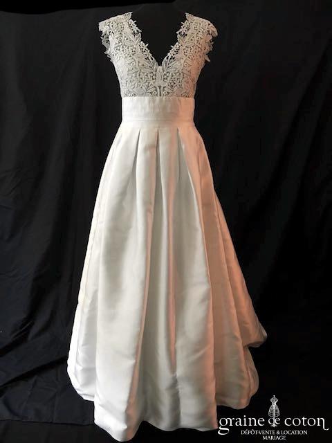 Robe une pièce ivoire clair : bustier tout en dentelle, décolleté V avec bretelles et dos nu. Jupe taille haute en mikado avec traîne pouvant se relever par un système de rubans. Lumineuse et raffinée.