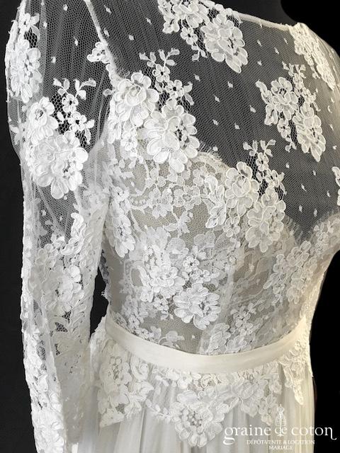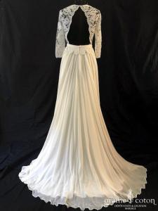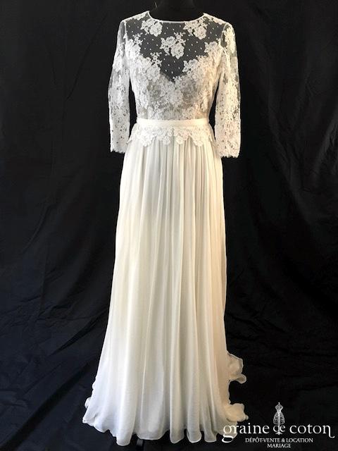 Robe une pièce ivoire clair : bustier tout en dentelle de Calais avec manches 3/4, dos nu fermé sur le haut. Jupe taille haute en mousseline de soie, fluide, légère et épurée. Lumineuse et raffinée.