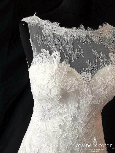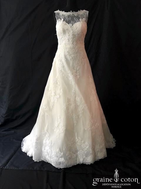 Robe une pièce ivoire clair : bustier recouvert de dentelle avec larges bretelles, dos en V boutonné. Jupe taille haute largement évasée en dentelle, traîne pouvant se relever par un crochet. Lumineuse et seyante.