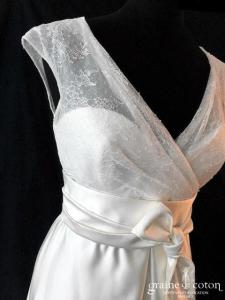 Robe une pièce ivoire clair : bustier en dentelle décolleté V, coupe empire, avec larges bretelles façon petites manches sur les épaules. Dos en V, lacé. Jupe taille haute avec large ceinture à nouer devant ou derrière en satin, pas de traîne. Belles finitions, délicate et raffinée.
