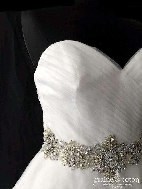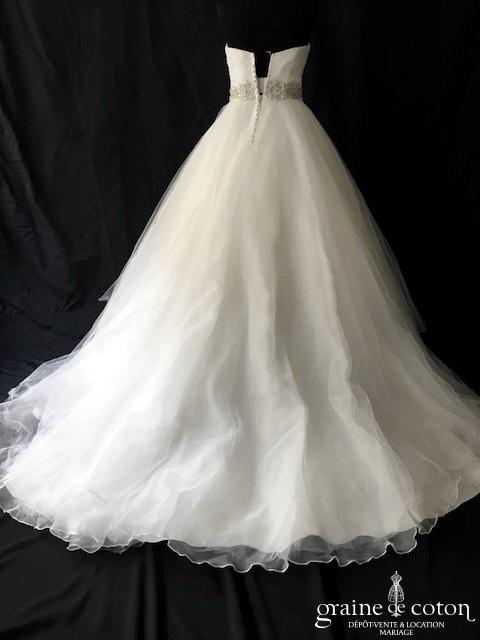 Robe une pièce tout en tulle ivoire clair : bustier coeur drapé, ceinture de strass délicate à la taille, dos boutonné. Jupe taille haute avec beaucoup de volume, tout en légèreté. Lumineuse et seyante.