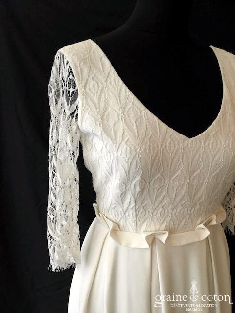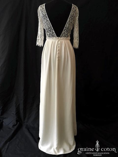 Robe une pièce ivoire : bustier en dentelle avec manches 3/4, dos nu. Jupe taille haute en crêpe de soie, boutonnée dans le dos, petite traîne. Légère, chic et bohème.