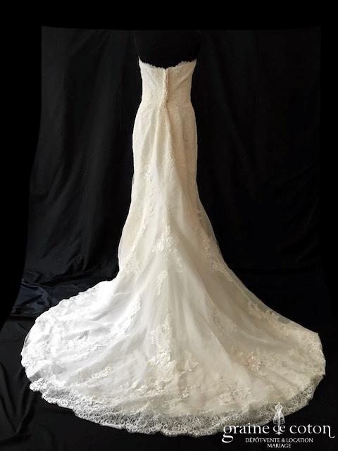 Robe une pièce tout en dentelle ivoire avec strass (que l’on peut retirer) : bustier coeur, dos lacé. Jupe fourreau légèrement évasée avec petite traîne. Ligne élégante, chic et glamour.