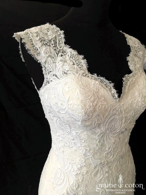 Robe une pièce en crêpe ivoire : bustier recouvert de dentelle avec larges bretelle,s décolleté en V, dos boutonné. Jupe sirène légèrement évasée avec très longue traîne pouvant se relever. Seyante, glamour et somptueuse.