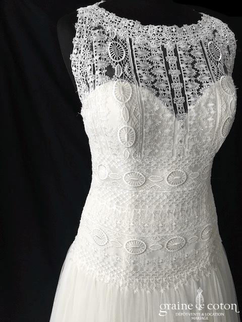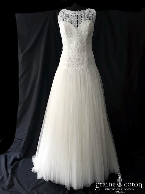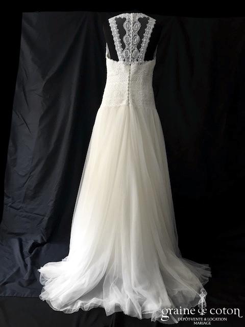 Robe une pièce ivoire : top en guipure avec bretelles façon encolure américaine, dos dégagé sur les côtés. Jupe taille basse en tulle fluide peu évasée mais avec beaucoup de matière, traîne. Champêtre et délicate.