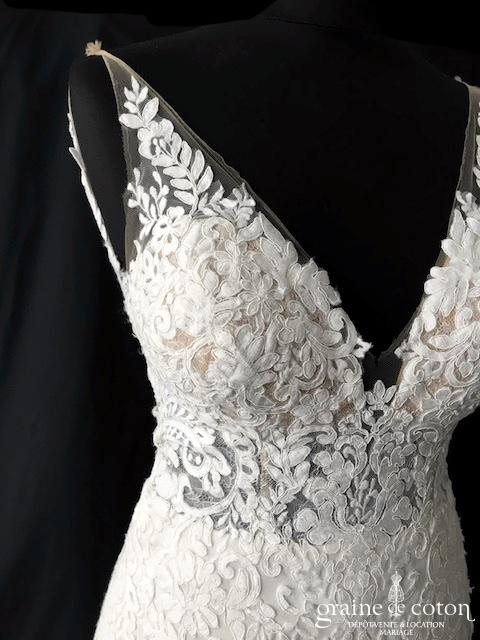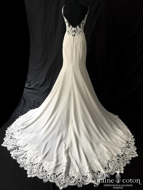 Robe une pièce en crêpe et dentelle ivoire : top décolleté en V, bretelles et dos nu. Jupe fourreau en crêpe fluide avec rappel de dentelle, traîne boutonnée jusqu’au bout et pouvant se relever. Glamour et seyante.