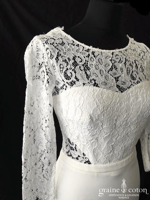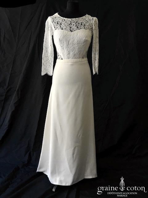 Robe une pièce ivoire clair : top en dentelle de Calais avec manches 3/4. Dos largement échancré en V puis boutonné. Jupe taille haute en crêpe de soie avec petite traîne. Chic et élégante.