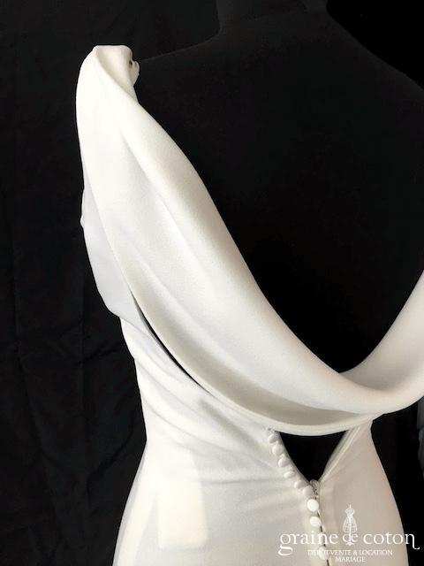 Robe une pièce tout en crêpe ivoire clair : top avec bretelles, décolleté en V, dos nu puis boutonné avec encolure bénitier. Jupe sirène épurée avec longue traîne. Sobre, classe et glamour.