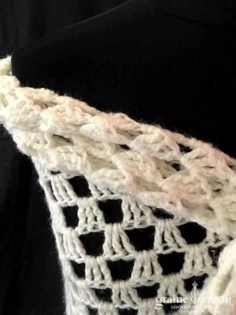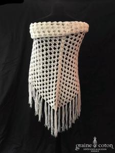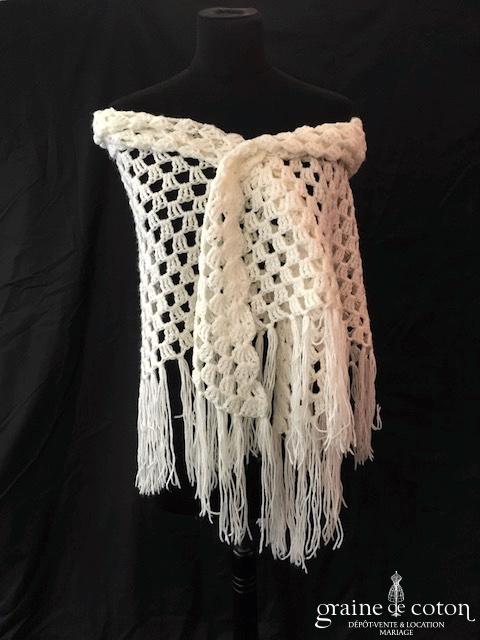 Châle en laine ajouré ivoire fait main. Forme classique triangle frangée, à nouer ou bien à attacher avec une épingle/broche. Esprit vintage tout en ayant chaud ;o)