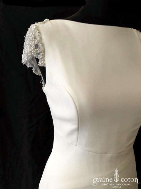 Robe une pièce tout en crêpe de soie ivoire : bustier avec petites manches perlées, encolure fermée et dos nu encadré de perles. Jupe taille haute puis légèrement évasée, avec longue traîne pouvant se relever. Joli contraste entre la simplicité de la coupe, la sobriété de la matière et le travail de perlage raffiné et lumineux. Glamour et élégante.