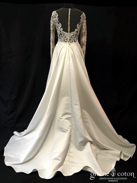 Robe une pièce ivoire clair : top en dentelle brodée, décolleté coeur, manches longues et dos boutonné. Jupe taille haute largement évasée en satin duchesse, tout en tenue. Petite traîne boutonné jusqu’au bout. Romantique et somptueuse, pour une mariée princesse bohème ;o)