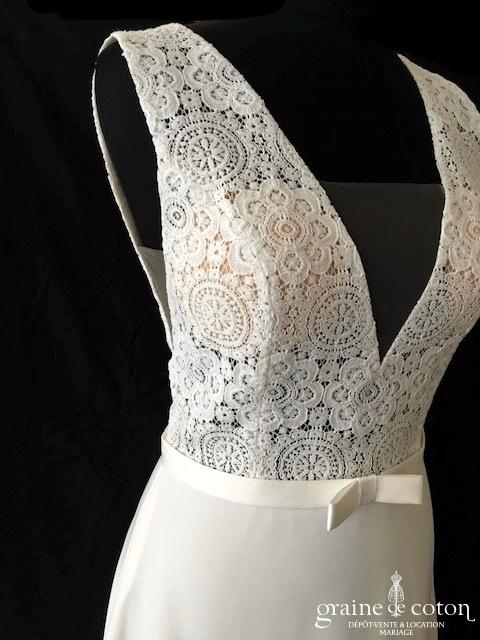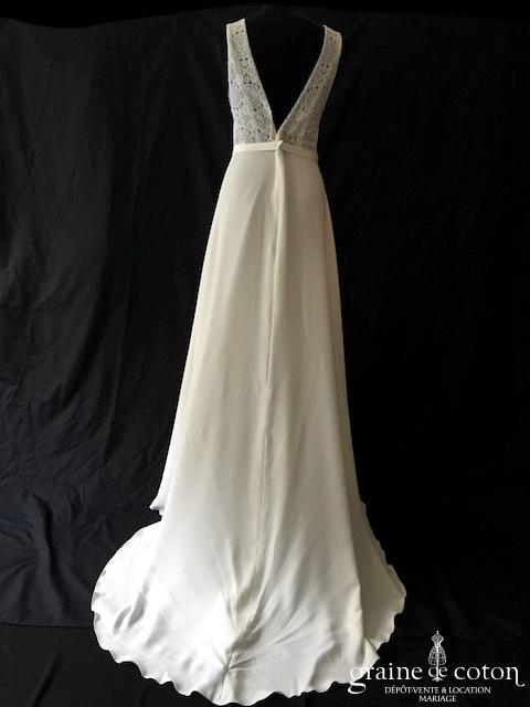 Robe une pièce ivoire clair : bustier en guipure avec larges bretelles, décolletés devant et dos en V. Jupe taille haute en crêpe fluide, épurée, légèrement évasée avec petite traîne. Bohème sobre et élégante.